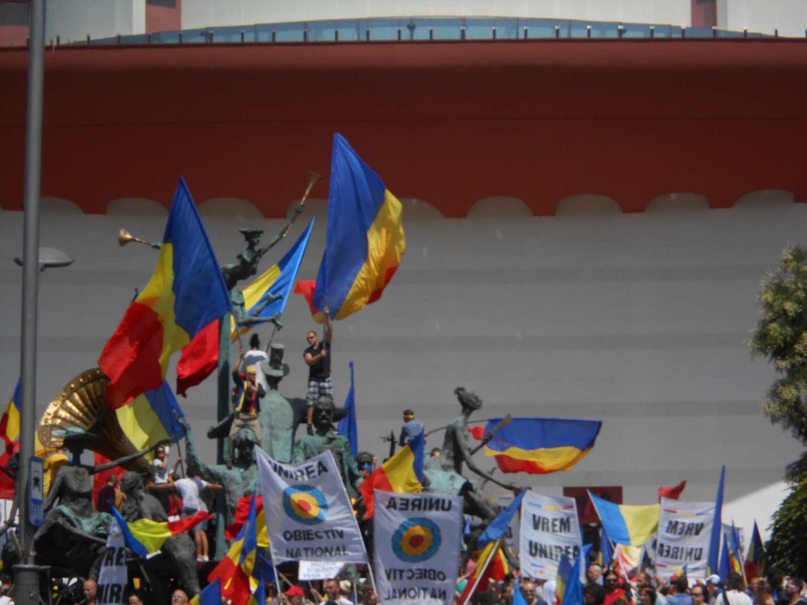Cu puțină întârziere față de ora programată – dar, noah, e greu de estimat exact ora sosirii unei mulțimi de circa 1000 persoane care vine pe jos din Chișinău – au sosit în Piața Universității românii noștri dragi de peste Prut. În Piață, în fața Teatrului Național îi așteptau deja câteva sute de oameni care empatizau cu dorința și suferința lor, unii dintre ei așteptând în soarele dogoritor pe lângă statuie, alții mai pe la umbră pe celălalt trotuar. Drapele fluturând, scandări din toată inima Vrem Unirea, cântece patriotice, speranțe licărind în ochii umeziți de emoția momentului, entuziam împărtășit și multe, mlte zâmbete adresate necunoscuților frați.